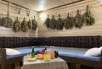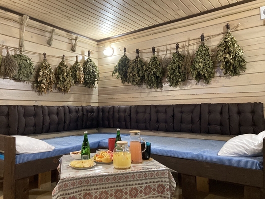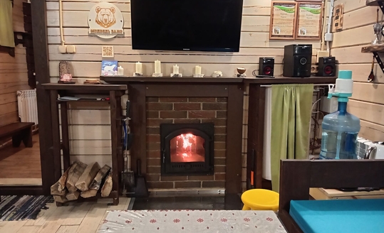 В перерывах между парениями Вас ждет уютная комната отдыха, где в приглушенном свете Вы можете наслаждаться пламенем живого огня, пить чай с медом, вести разговоры наполняющие друг друга.
